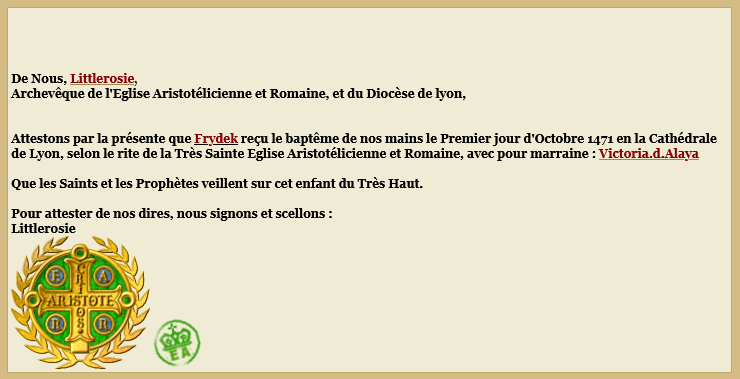 - Date, lieu et célébrant du baptême de l'époux : 1er octobre 1471 à Lyon par littlerosie