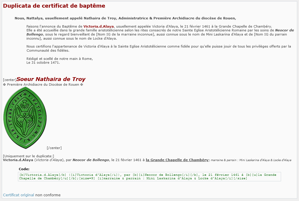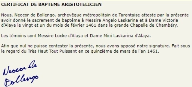 - Date, lieu et célébrant du baptême de l'épouse : [21 février 1461 à Chambéry par Nattalya /b]