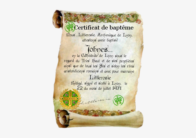 - Certificat de baptême de l'épouse : [quote="Nathaira"]En relation avec le baptême de Alixane