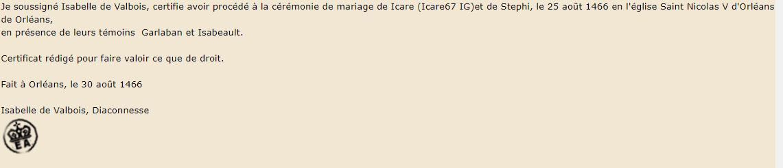 MessagePosté le: Jeu Nov 29, 2018 10:24 pm    Sujet du message: [OE Nationale] Dissolution de mariage Icare & Stephi Répondre en citant