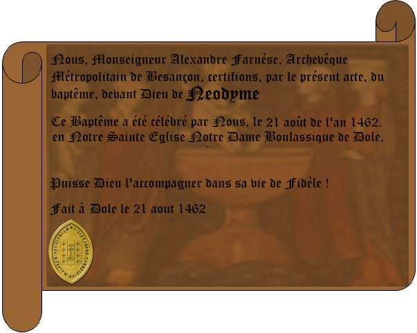 - Date, lieu et célébrant du baptême de l'époux : 21 aout 1462, Dole, par Monseigneur Alexandre farnèse