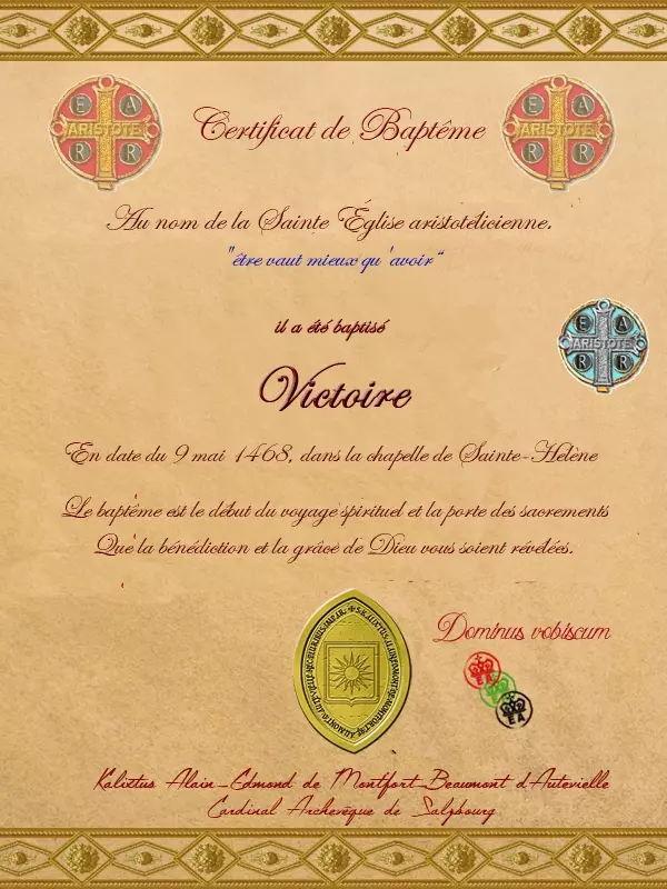 - Date, lieu et célébrant du baptême de l'épouse : 9 mai 1468 à la Chapelle Saint Hélène (Strasbourg), célébré par le Cardinal Kalixtus