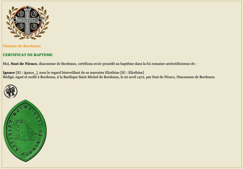 - Date, lieu et célébrant du baptême de l'époux : Le 20 avril 1472, en la Basilique Saint Michel de Bordeaux par Susi de Niraco