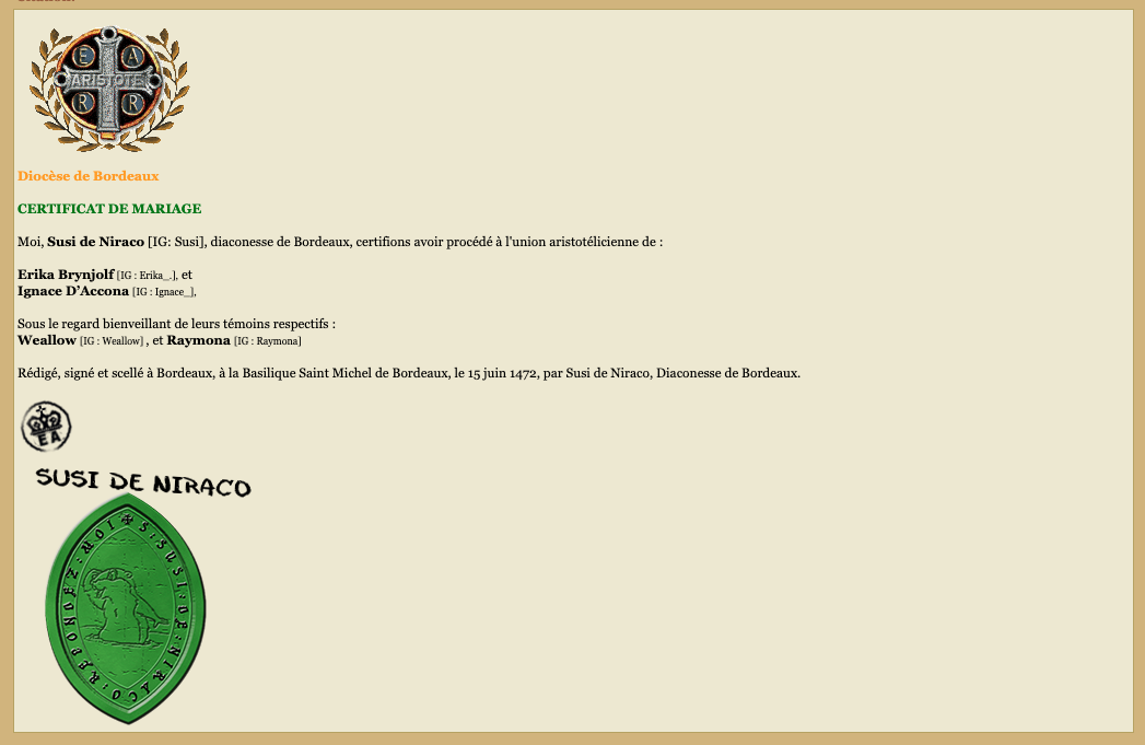 - Noms et âge des éventuels enfants du couple (IG et RP) (préciser s'il y a accord sur la garde des enfants mineurs) : Aksel Ignace Aymon d'Accona, né le 12 juillet 1473 (non joué)