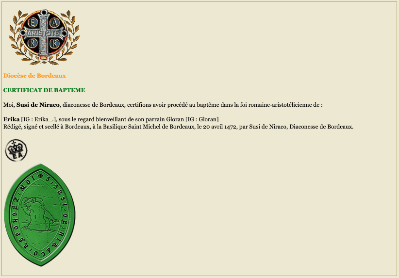 - Date, lieu et célébrant du baptême de l'épouse : Le 20 avril 1472, en la Basilique Saint Michel de Bordeaux par Susi de Niraco